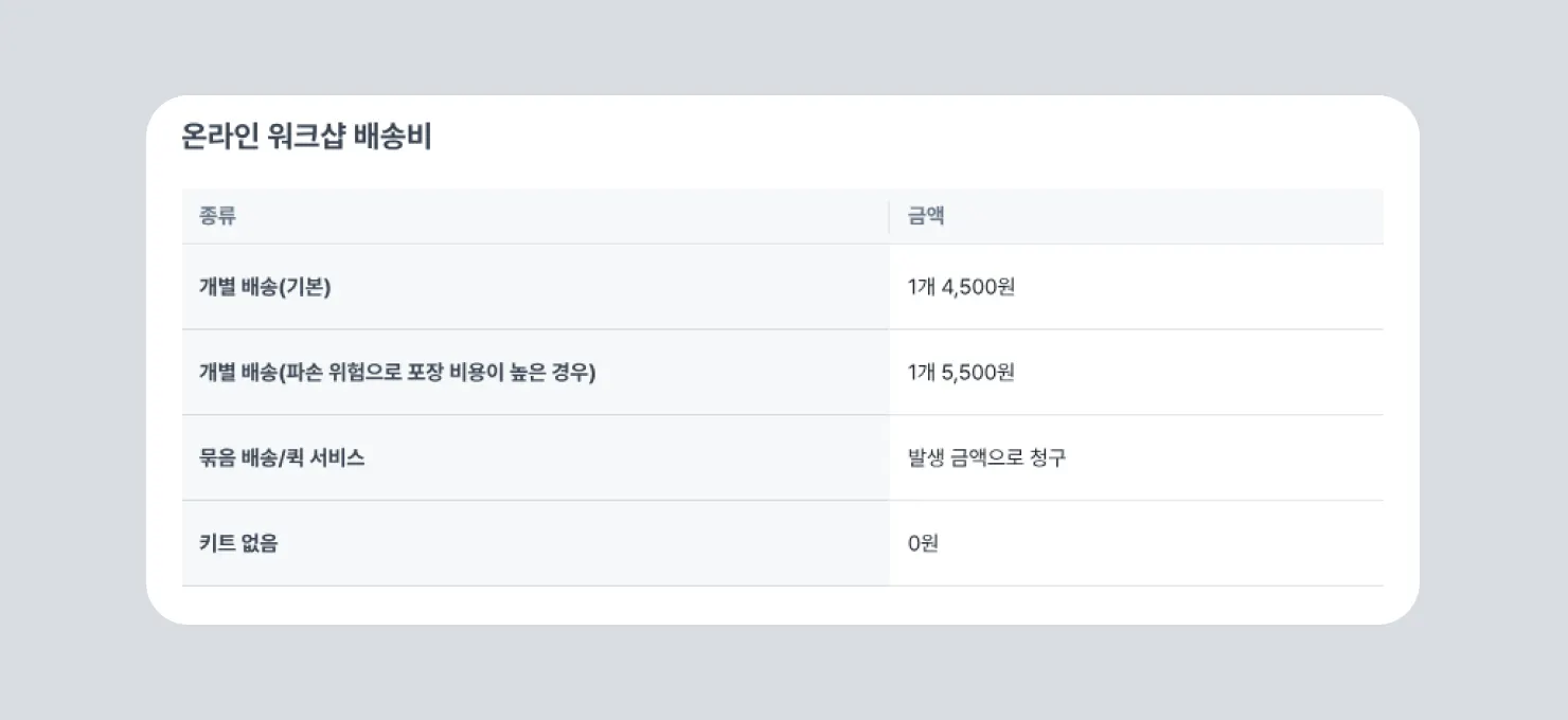 온라인 진행 시 키트가 필요한 경우 아래와 같이 표준 배송비가 발생합니다.