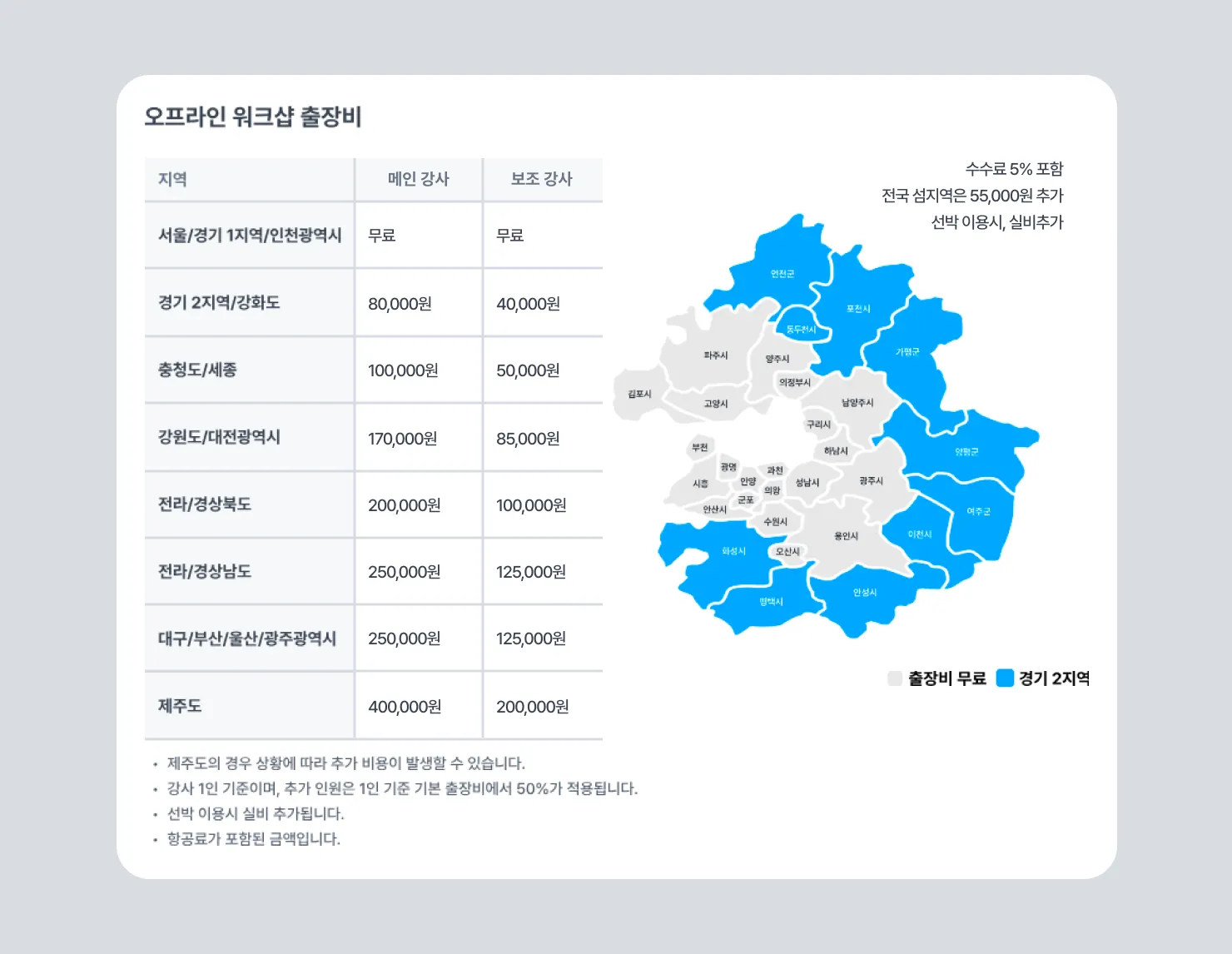 *위 금액은 표준 비용이며, 보조 강사의 경우 메인 강사의 1/2 금액이 적용됩니다.