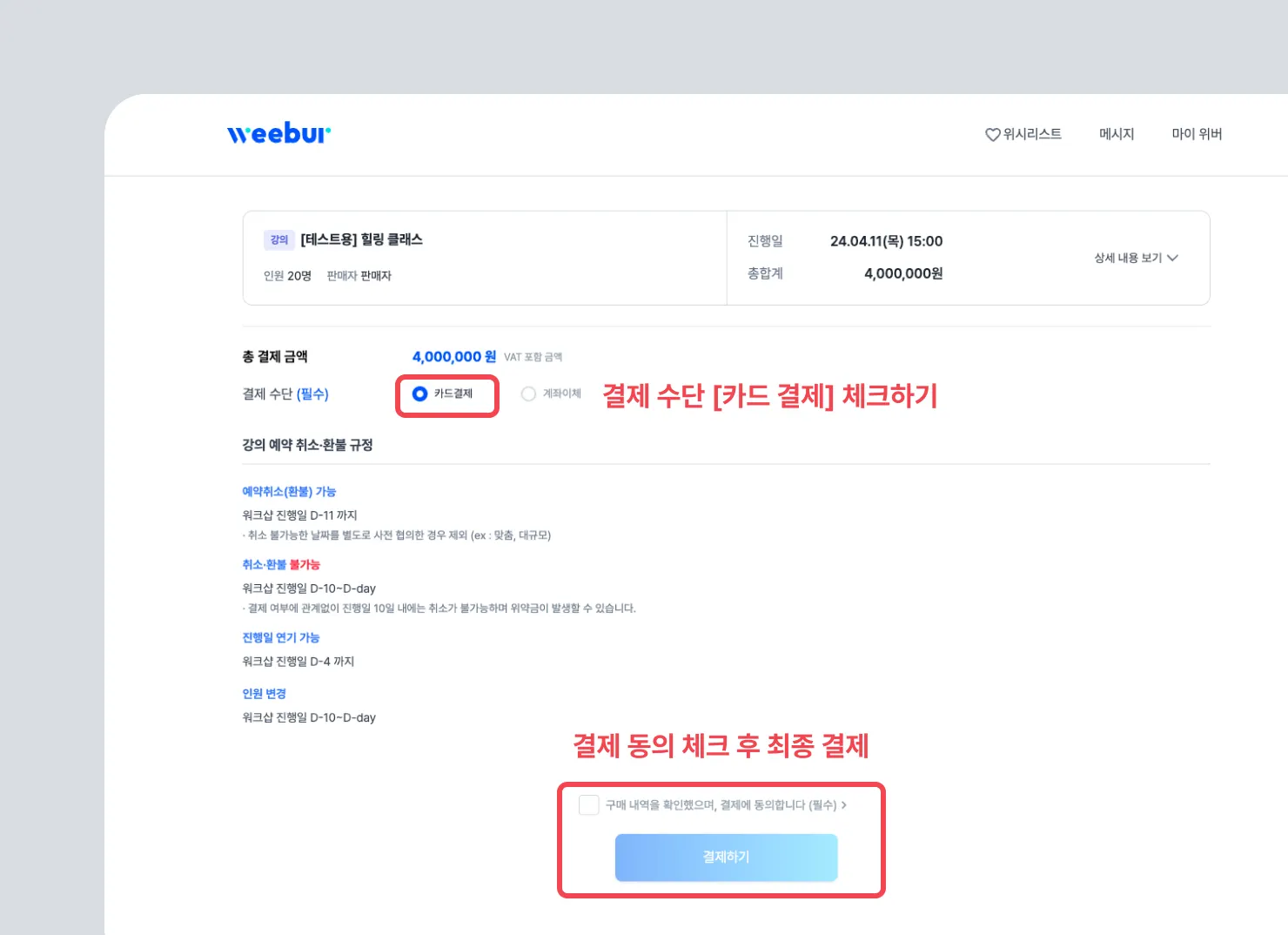 기본 규정 내 결제 불가 시 진행일 이후 10일 까지 카드결제 / 입금 완료