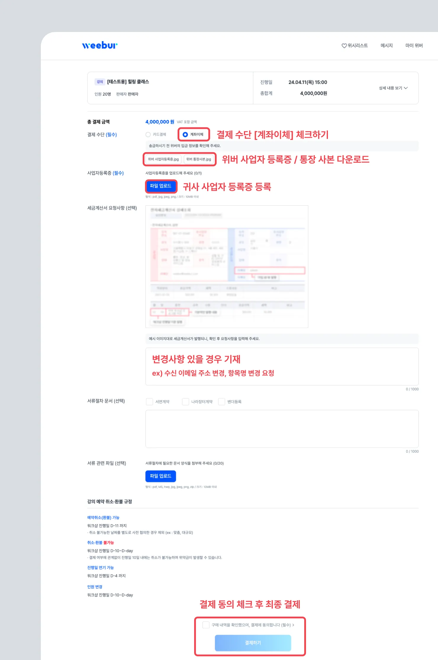 *이외에 결제 특이사항이 있는 경우에는 위버 매니저에게 문의 바랍니다.